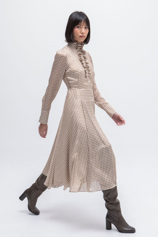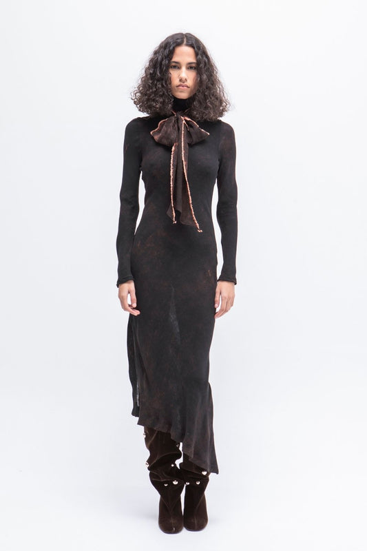 Los tejidos cálidos y envolventes dialogan con siluetas fluidas que evocan movimiento. Los tonos de la tierra —ocres, arcillas, grises minerales— se entrelazan con destellos metálicos y matices profundos de verde y azul, símbolos de resiliencia y expansión. Cada prenda es un puente entre lo clásico y lo vanguardista, entre lo orgánico y lo urbano.