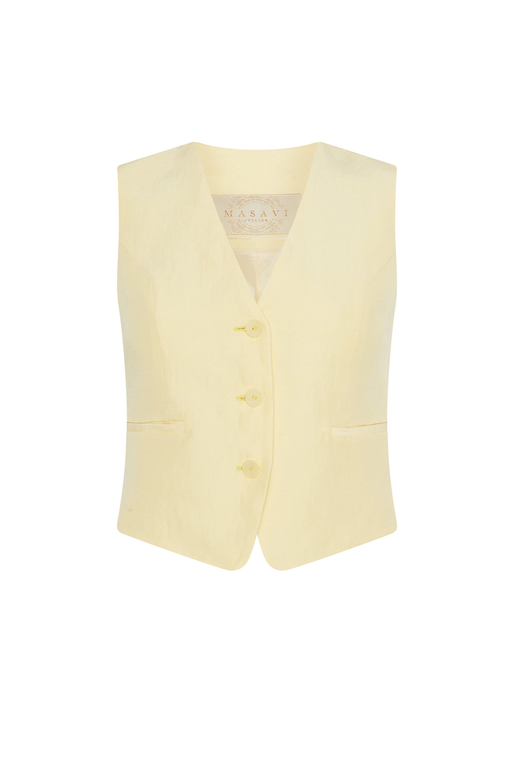 Chaleco en color amarillo empolvado de diseño estructurado con un toque clásico y sofisticado. Confeccionado en un tejido ligero, este modelo presenta un escote en "V" y cierre frontal con tres botones a juego, ofreciendo un ajuste cómodo y favorecedor. Incluye discretos bolsillos decorativos en la parte delantera para un acabado elegante.