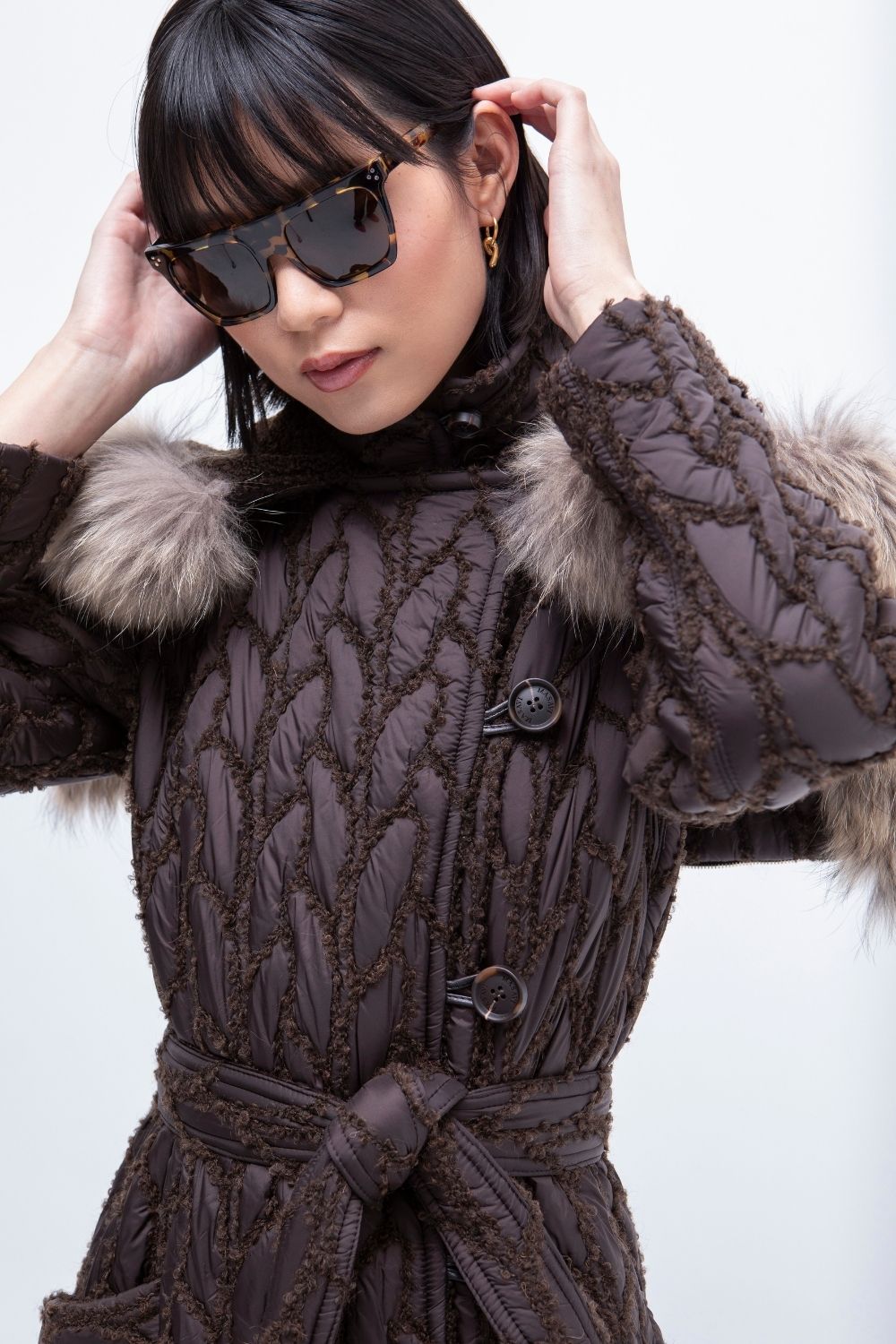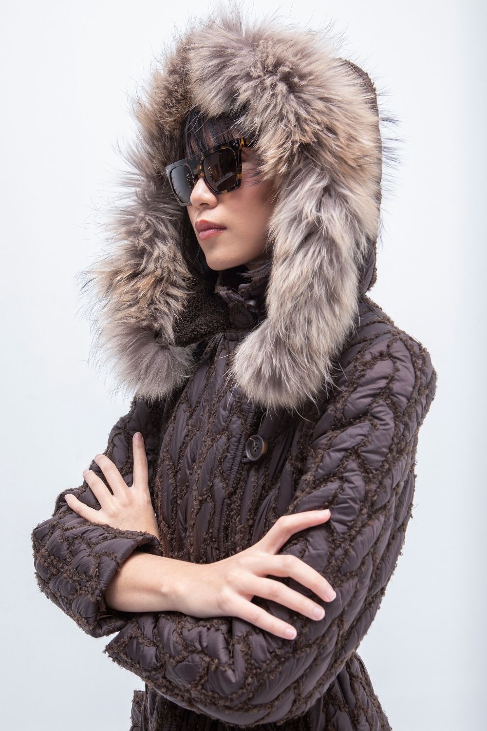 Abrigo largo confeccionado en tejido acolchado de tono marrón oscuro, con un diseño en forma de espiga que recorre toda la superficie. Su estructura cruzada incorpora botones de gran tamaño en la parte delantera, ligeramente desplazados hacia un lado, lo que genera un efecto envolvente. Incluye un cinturón del mismo tejido que permite ajustar la prenda a la cintura. Destaca por su maravillosa capucha partida al centro con cremallera y  por el detalle de la piel de marmota en todo el borde de la capucha, en tonos naturales que contrastan con la base marrón del abrigo. El cuello es alto y estructurado, sujeto con botones con la opción de poder quitar o poner. Las mangas son rectas y la silueta es amplia, con caída hasta media pierna. Una prenda de invierno con presencia, pensada para ofrecer abrigo y estilo en igual medida.