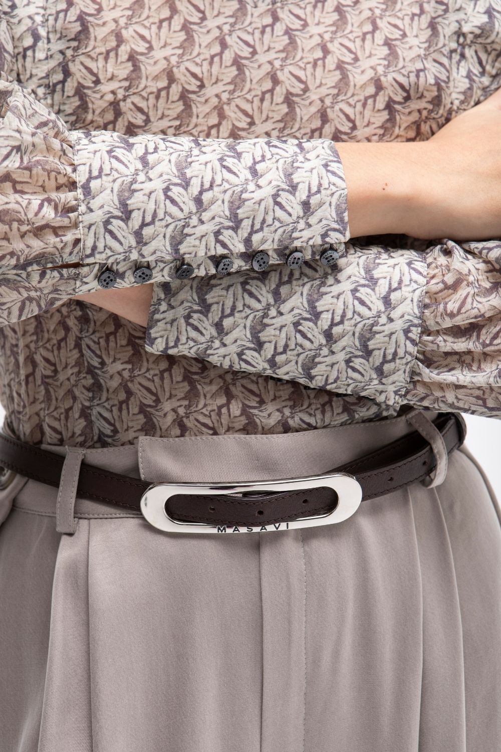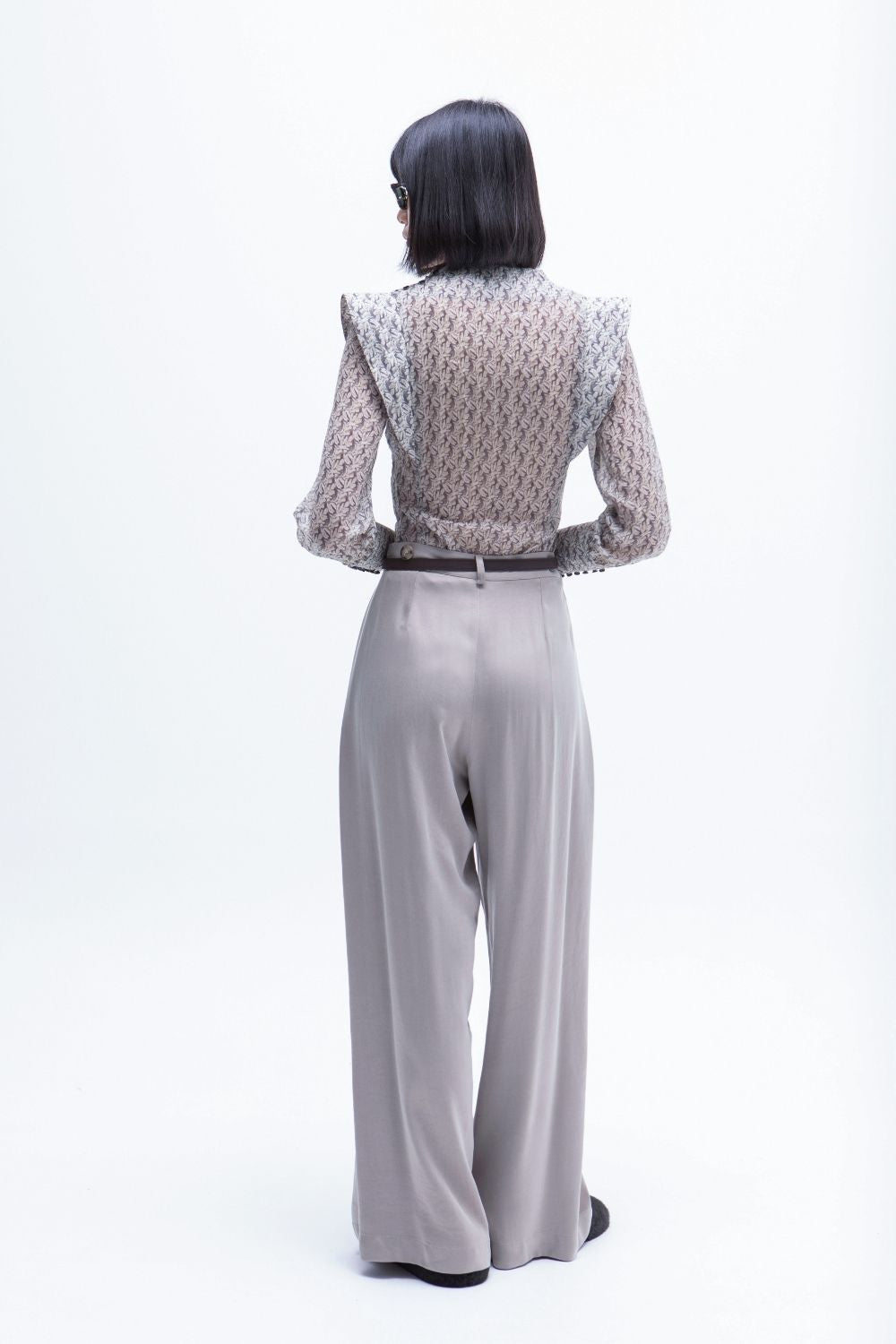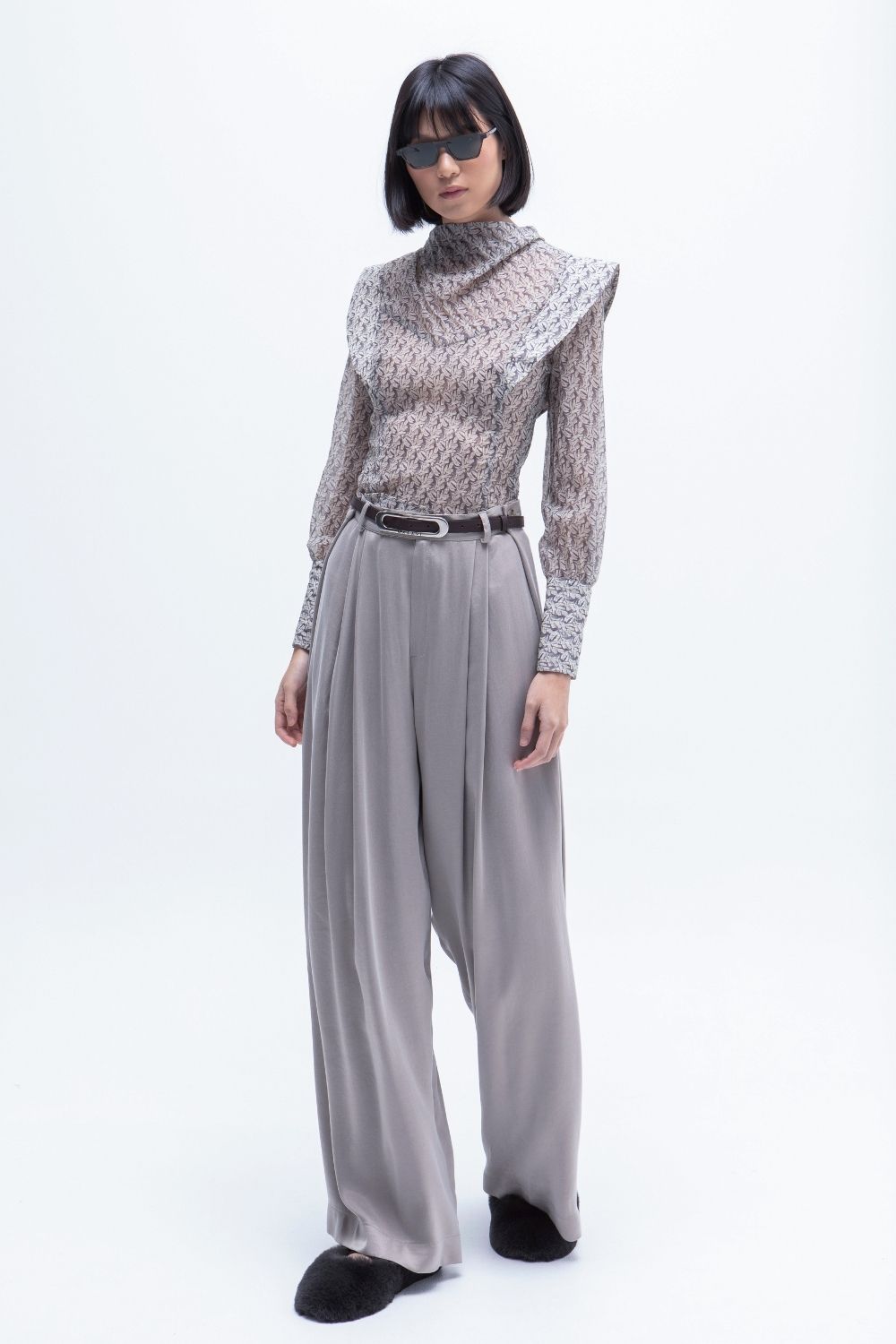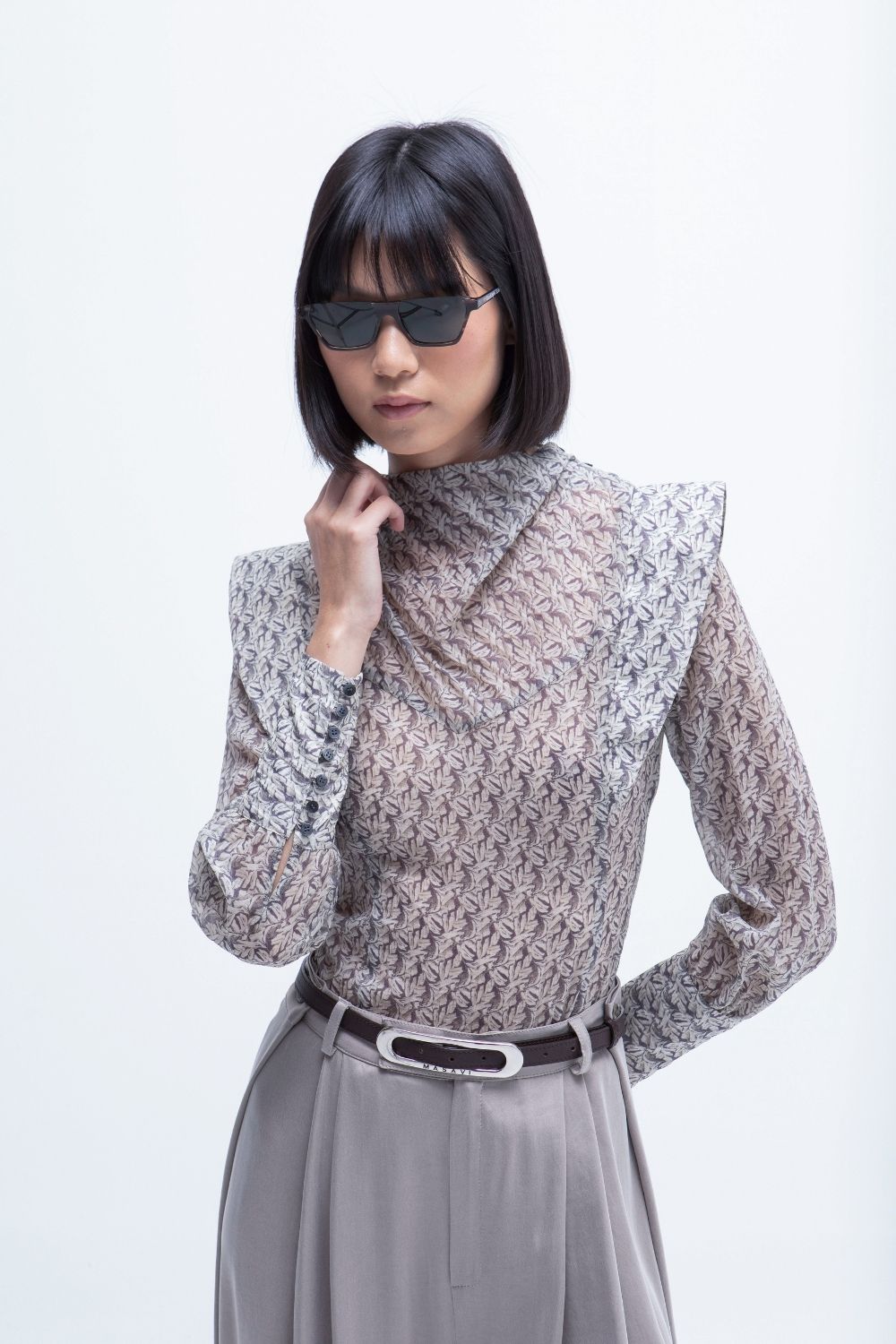 Blusa estructurada de silueta entallada con estampado delicado en tonos piedra, confeccionada en tejido ligero con textura suave que aportan un efecto visual sofisticado y elegante. El diseño se distingue por su cuello al bies que se adapta suavemente al contorno del cuello, aportando una terminación pulida y femenina. Los hombros presentan una pieza marcando volumen que estiliza la figura y añade un aire contemporáneo, mientras que las mangas largas finalizan en puños altos con una hilera de botones, un detalle que aporta carácter y refinamiento.