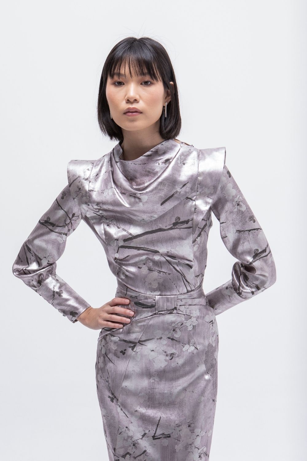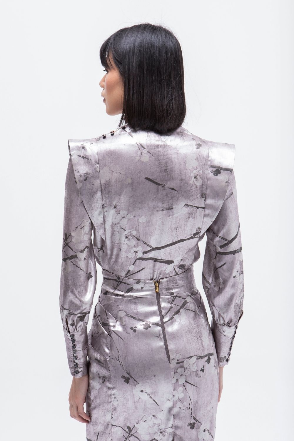Blusa estructurada de silueta entallada, confeccionada en un tejido de seda con textura laminada que genera un sutil brillo metálico, creando un efecto visual de profundidad y dinamismo.  El diseño se distingue por su cuello al bies que se adapta suavemente al contorno del cuello, aportando una terminación pulida y femenina. Los hombros presentan una pieza marcando volumen que estiliza la figura y añade un aire contemporáneo, mientras que las mangas largas finalizan en puños altos con una hilera de botones, un detalle que aporta carácter y refinamiento.