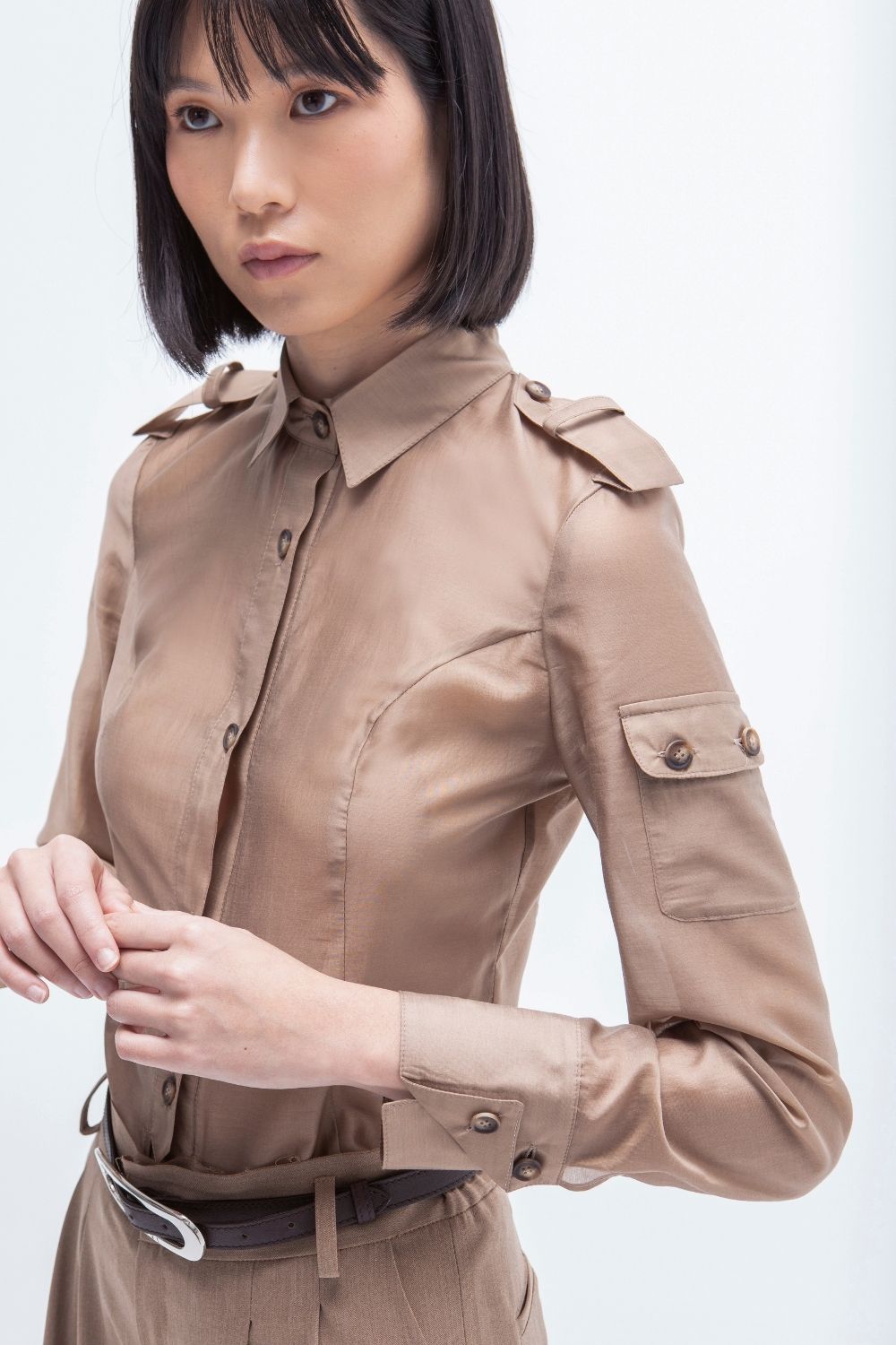 Camisa entallada de textura ligera y caída fluida, con un diseño de inspiración cargo. Incorpora detalles marcados en los hombros y un bolsillo con solapa en una de las mangas. Las costuras verticales ayudan a definir la silueta, mientras que el cuello clásico, los puños anchos y la botonadura frontal aportan estructura al conjunto. Una prenda sobria y versátil, ideal para combinar con pantalones relajados o piezas más pulidas.