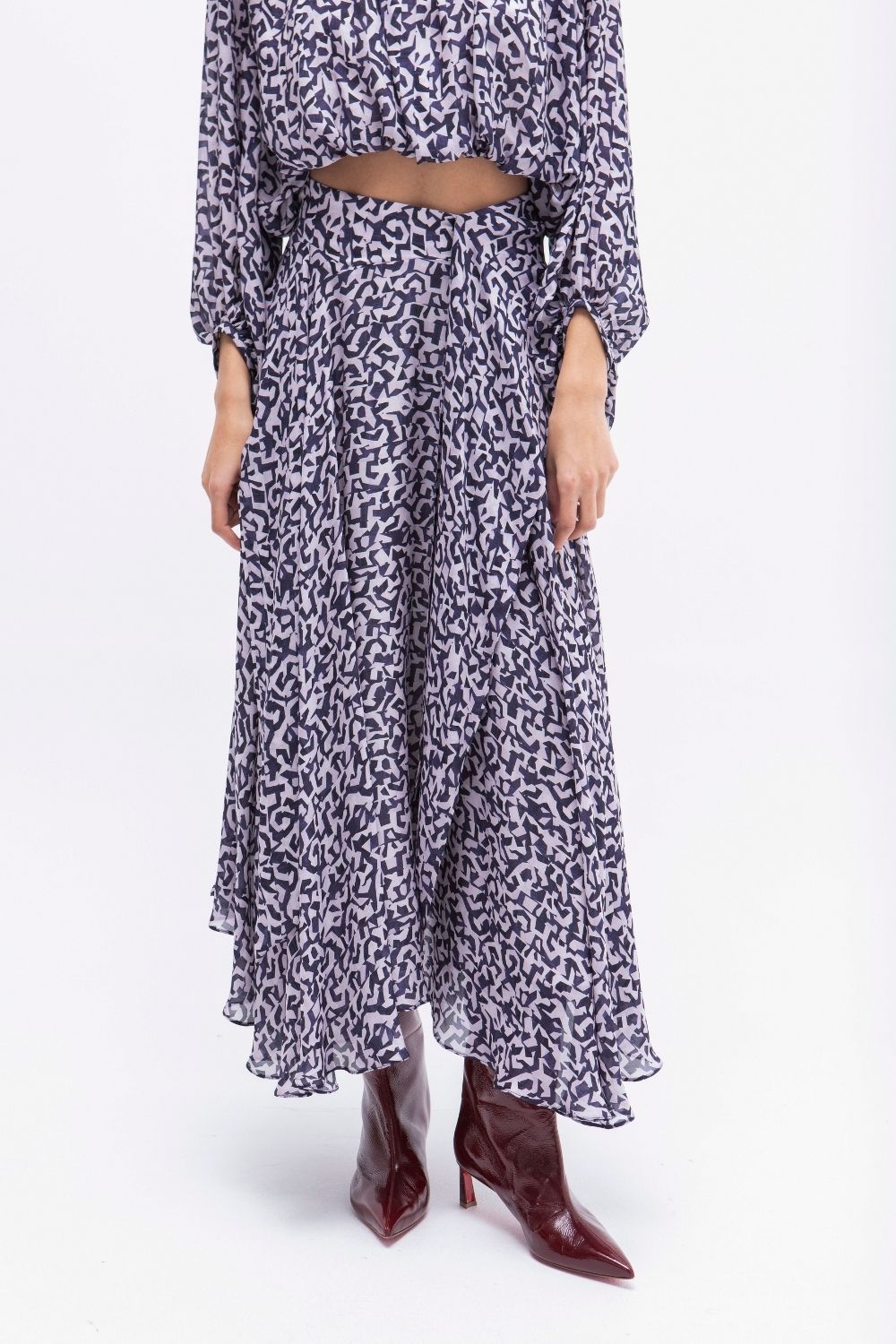 Falda larga con estampado abstracto en tonos crudo y marino, confeccionada en una maravillosa calidad de viscosa con caída fluida. El diseño incorpora una cinturilla ancha cruzada en la parte delantera, con un lazo integrado del mismo tejido que cuelga de manera decorativa hacia un lado. El volumen de la falda se construye a través de paneles de tela que generan un movimiento dinámico al andar. El bajo presenta un acabado irregular y asimétrico, con capas suaves que terminan en ondas, aportando ligereza visual.