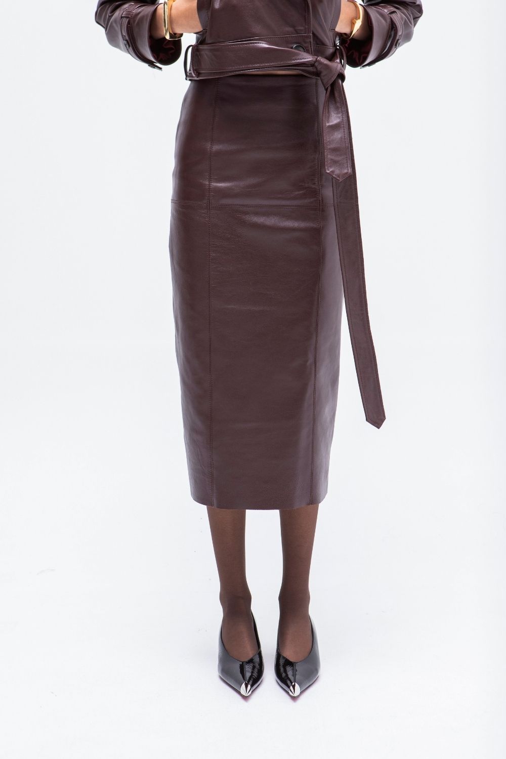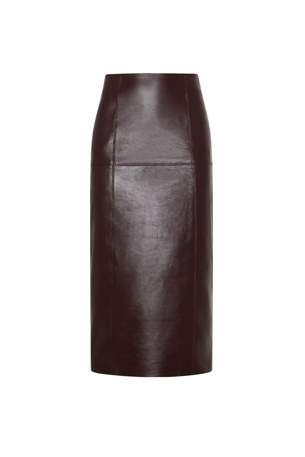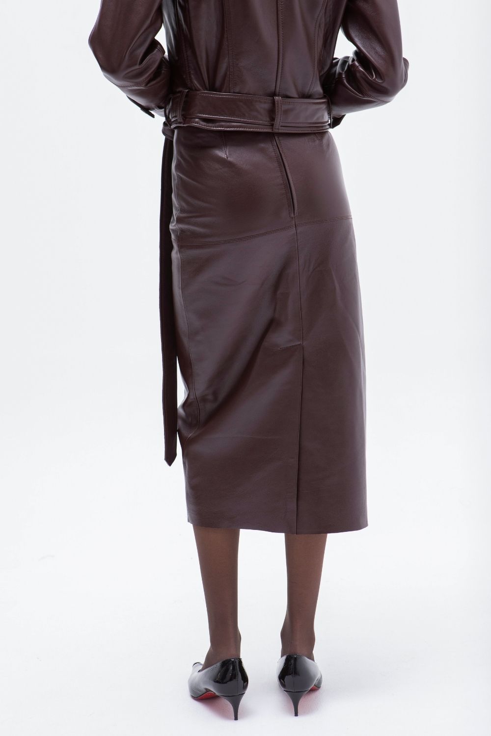 Falda de tubo en piel de cordero berenjena ceñida al cuerpo, con cintura alta y largo por debajo de la rodilla. Una prenda elegante, sobria y versátil, perfecta tanto para un look de oficina como para estilismos más sofisticados de noche.