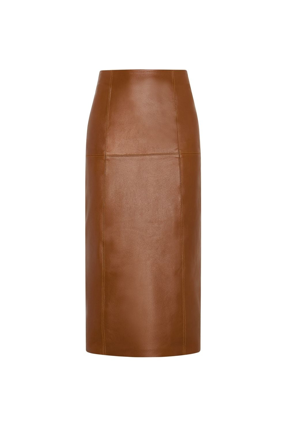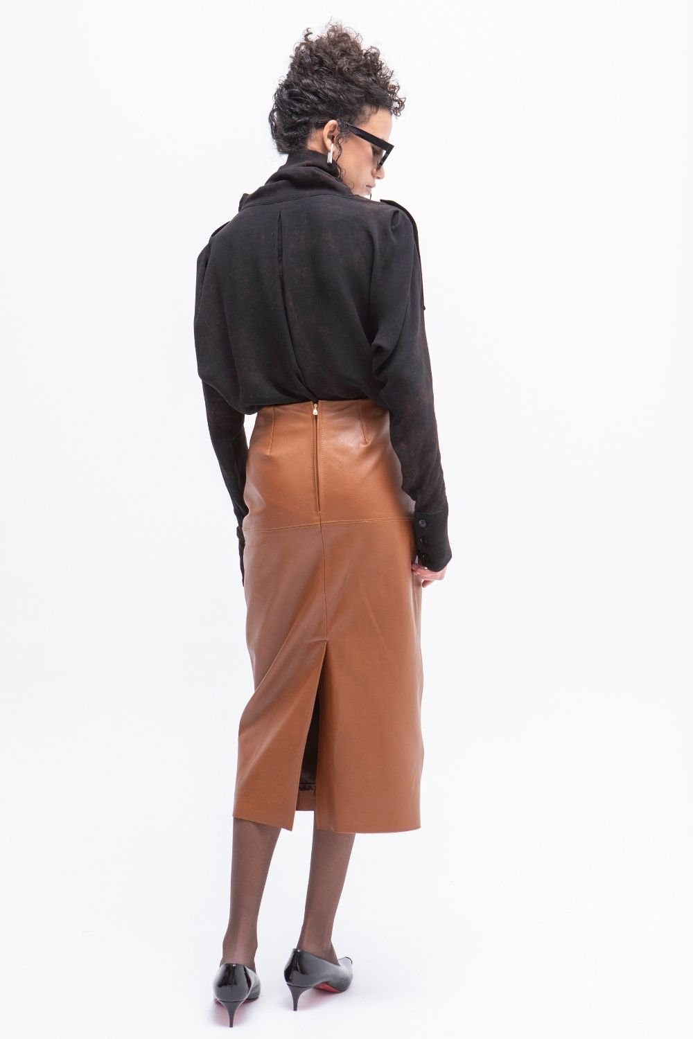 Falda de tubo en piel de cordero color cuero ceñida al cuerpo, con cintura alta y largo por debajo de la rodilla. Una prenda elegante, sobria y versátil, perfecta tanto para un look de oficina como para estilismos más sofisticados de noche.