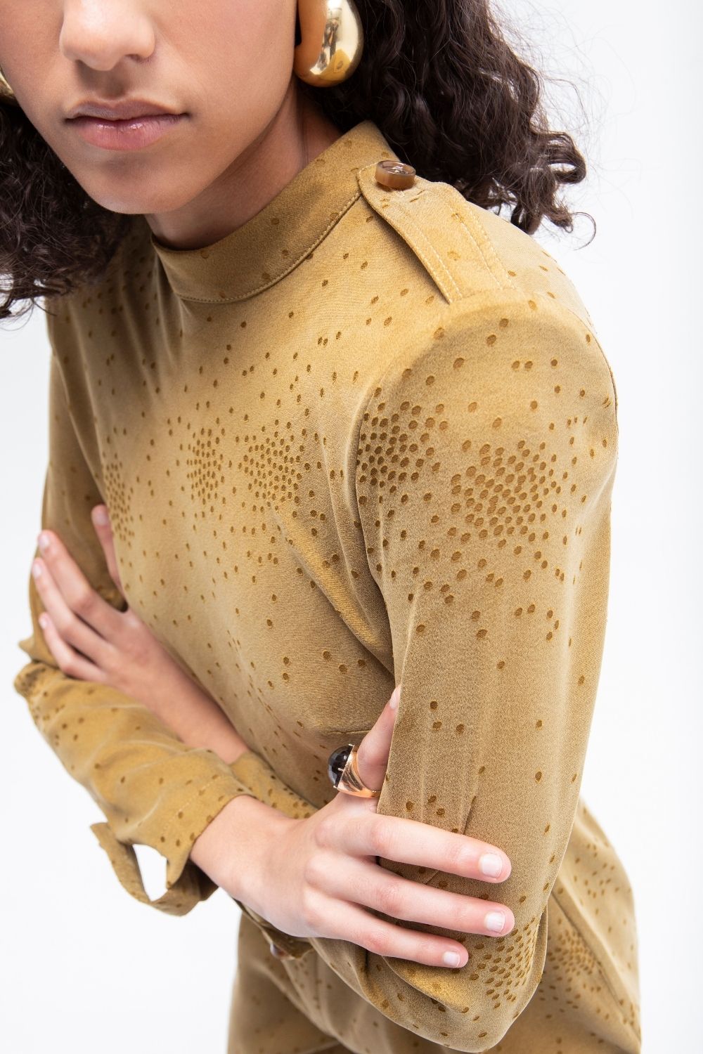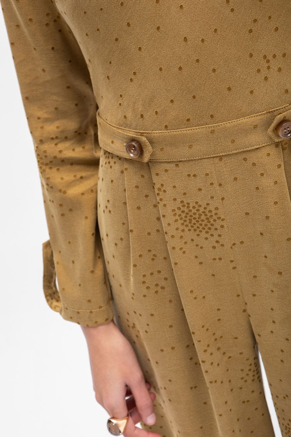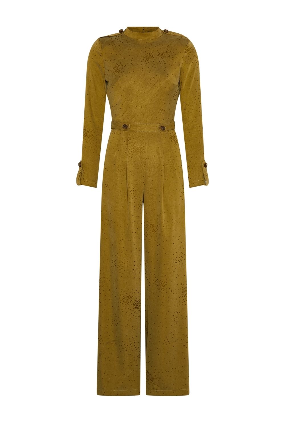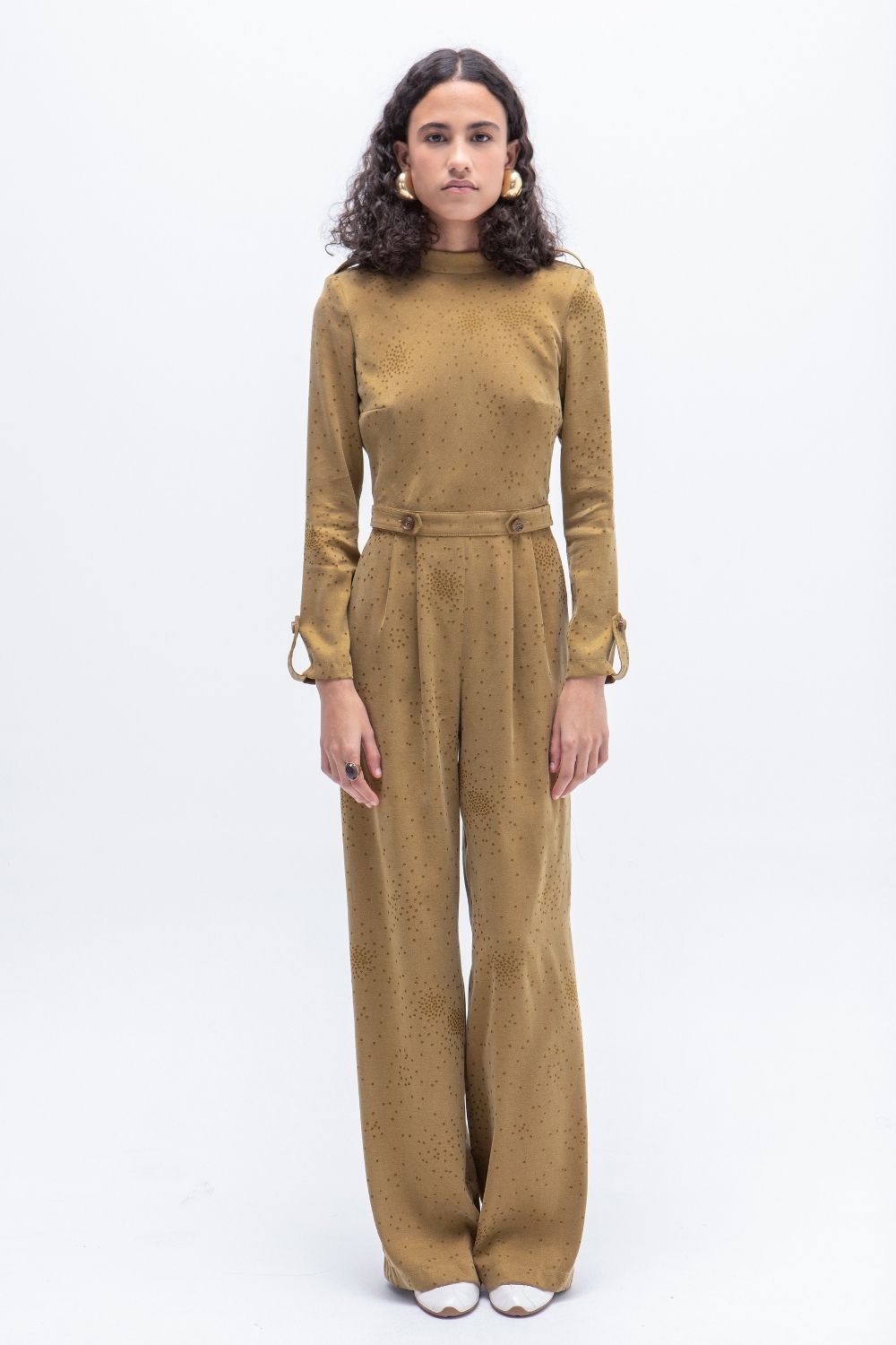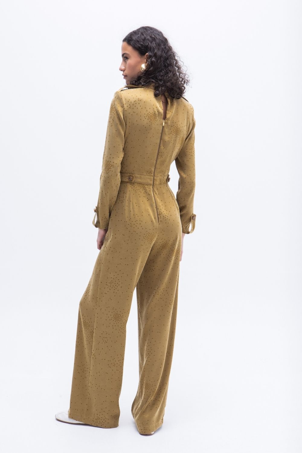 Mono largo con estampado devoré en una base de viscosa en tono verde oliva. Presenta un diseño de cuello subido y manga larga, con puños ajustados mediante trabillas cerradas con botón. La parte superior se ajusta al cuerpo, mientras que el pantalón de corte recto y pernera amplia incorpora pinzas delanteras que aportan estructura y volumen. La cintura está marcada por una pieza del mismo tejido con botones decorativos a cada lado, que refuerzan la silueta. También se aprecian botones decorativos en los hombros, dispuestos de forma simétrica. El acabado general es limpio, con líneas definidas y una caída fluida.
