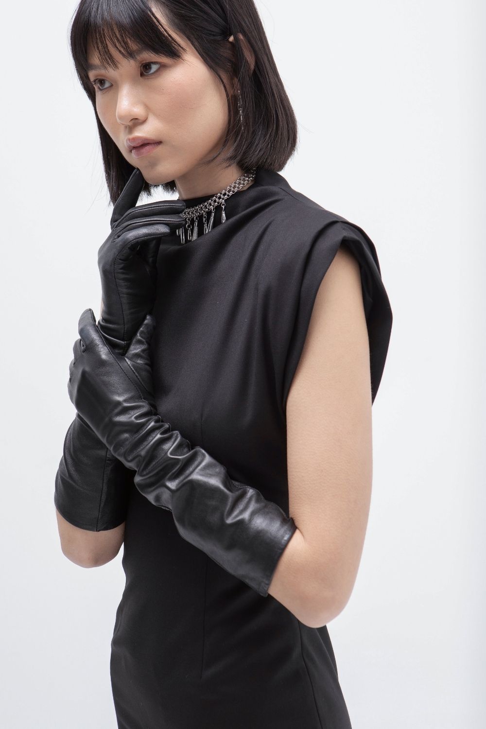 Vestido negro de corte midi con un diseño sofisticado y favorecedor. Su silueta entallada realza la figura, mientras que el cuello halter aporta un aire elegante y moderno. Las mangas japonesas, realzadas con hombreras, añaden estructura y un toque de fuerza al diseño, creando un look contemporáneo y de impacto, perfecto para eventos especiales.