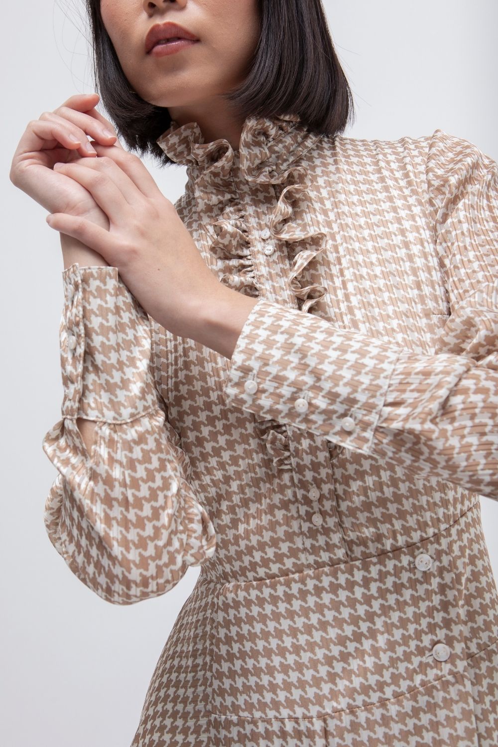 Una silueta de inspiración vintage reinterpretada con la delicadeza contemporánea que define el universo MASAVI. Este vestido está confeccionado en un tejido ligero de estampado pata de gallo en tonos beige y crudo, que aporta un equilibrio perfecto entre sofisticación y atemporalidad. El diseño destaca por su cuello alto con volante fruncido y el detalle de pequeños volantes verticales en el pecho, que aportan un aire romántico y refinado. Destacamos la estructura de la falda, mezclando tablas y capas  que realzan la figura de forma sutil, aportando movimiento con elegancia. Una pieza versátil que se adapta tanto a ocasiones especiales como a looks de día elevados, siempre con una actitud femenina y exquisita.